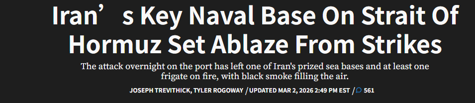 当地时间3月2日深夜,伊朗伊斯兰革命卫队司令顾问表示,霍尔木兹海峡已被关闭,伊方将打击所有试图从霍尔木兹海峡通过的船只。截至目前伊朗伊斯兰革命卫队暂未发表官方声明。美国总统特朗普3月1日则称“美方已摧毁并击沉9艘伊朗海军舰艇”。美方卫星图像显示,伊朗海军重要基地受损严重。外界普遍认为美军打击伊朗军舰旨在消灭伊朗可能用于封锁霍尔木兹海峡的军事力量。