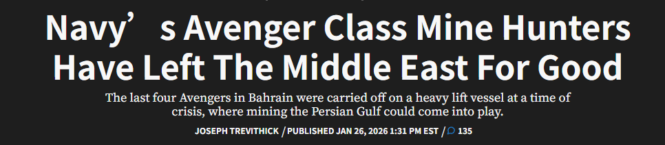 理论上,部署在中东的美军具备一定的扫雷和猎雷能力,但相比海湾战争时期有了明显的下降。美国“动力”网站“战区”频道此前提到,美国多次威胁对伊朗动武之际,美国海军却从2025年9月开始相继退役了部署在巴林的4艘“复仇者”级专用扫雷舰,并在今年1月将它们用重型运输船运回美国本土。