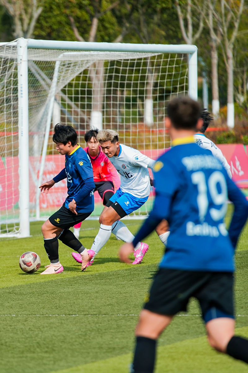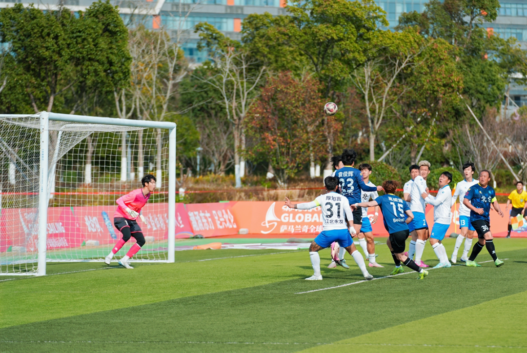 到第18分钟,北仑队利用定位球打破僵局,左路传中吊入后点,江北队后点防守漏人,35号高鹏与对手35号李毅贴身对抗,高鹏胸口停球后凌空抽射,球直钻死角,北仑1:0领先!